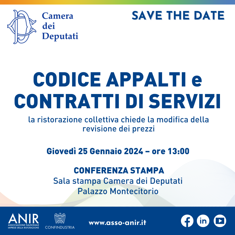 ANIR Confindustria, l’Associazione Nazionale delle Imprese della Ristorazione collettiva, aderente a Confindustria, nella persona del Presidente Massimo Piacenti, Vi invita alla conferenza stampa indetta Giovedì 25 Gennaio 2024 a partire dalle ore 13 presso la sala stampa della Camera dei deputati – palazzo Montecitorio, per importanti comunicazioni che riguardano la proposta di modifica o correzione del Codice Appalti, con una normativa specifica per i contratti di servizi, in particolare la revisione dei prezzi (art. 60) di fondamentale importanza per la Ristorazione Collettiva e i contratti pluriennali e continuativi. Inoltre, la richiesta della costituzione della prevista cabina di regia presso la Presidenza del Consiglio.